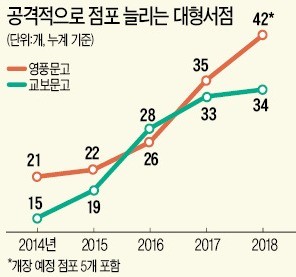 대형 서점들이 ‘출점 전쟁’을 연상시킬 정도로 급속히 매장을 늘리고 있다. ‘빅2’인 교보·영풍문고는 전체 매장(71개)의 45%인 32개를 2016년 이후 2년3개월 새 집중적으로 열었다. 독서율 감소로 침체를 겪고 있는 서점업계가 공격적으로 매장을 확장하는 것은 신규 고객 발굴은 물론 중소기업 적합업종 지정 해제라는 만일의 경우에 대비한 입지 선점 전략이란 분석이다.