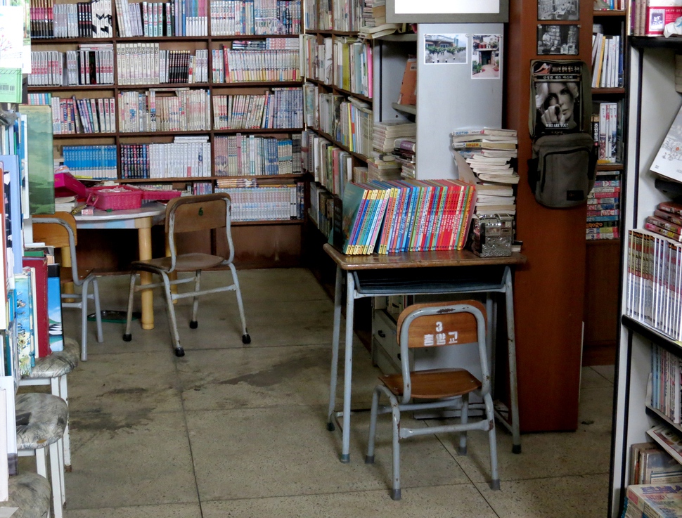 (사진3) 도서관으로 변한 교실. 초등학교 때 사용하던 책상과 의자를 그대로 열람실 사무용품으로 쓰고 있다.