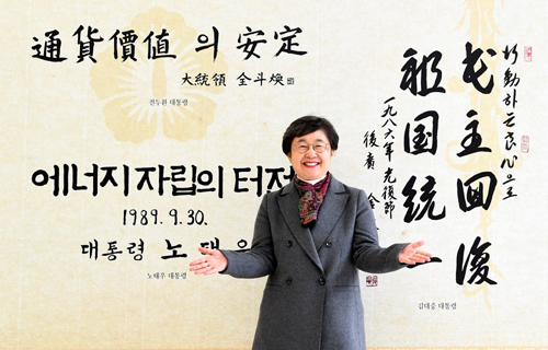 (사진 맨 위) 지난 23일 경기 성남시 서울기록관에서 이소연 국가기록원장이 역대 대통령 휘호를 담은 전시물 앞에서 사진을 촬영하고 있다. 이제원 기자