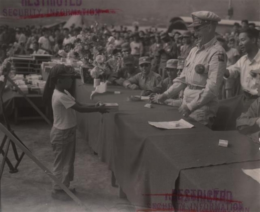 (사진1) 1951년 10월 경남 거제포로수용소에서 포로 대표로 나선 8살 아이가 미군 대령으로부터 재교육과 관련한 상을 받고 있다. 대한민국역사박물관 제공