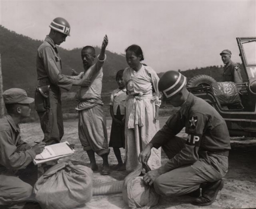 (사진2) 1951년 7월 피난민으로 보이는 민간인 가족이 포로수용소에 수용되기에 앞서 신체 수색을 받고 있는 모습. 대한민국역사박물관 제공