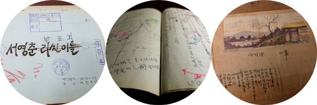 (사진2) 왼쪽부터 1978년 3월 대한극장에서 공연된 서영춘 발표회의 대본, 극단 ‘광장’에서 이진순이 연출한 ‘갈매기’의 대본, 악극배우 김태랑의 무대미술 스케치 자료 모음. 예술자료원 제공
