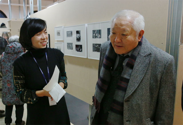 (사진1) 김현옥 학예사(왼쪽)가 임영웅 연출가에게 2014년 ‘연출가 임영웅과 고도를 기다리며’ 아카이브전에서 전시 내용을 설명하고 있다. 예술자료원 제공