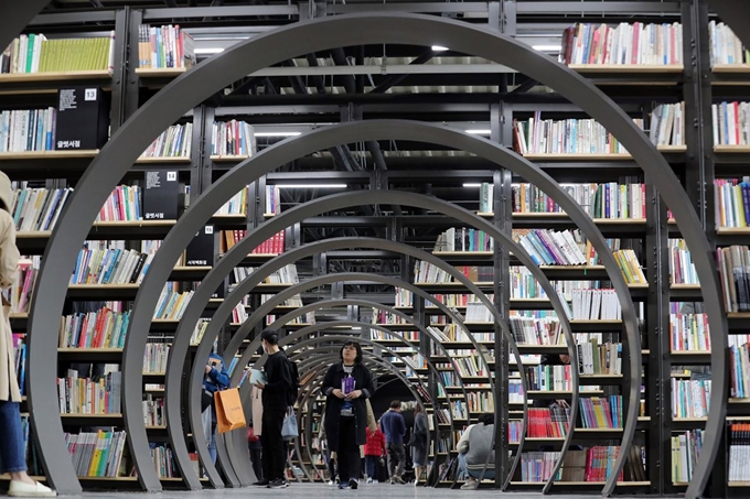 (사진1) 27일 서울 송파구 잠실나루역 근처에 개관한 전국 최초의 공공 헌책방 ‘서울책보고’를 찾은 시민들이 책을 고르고 있다. 뉴스1