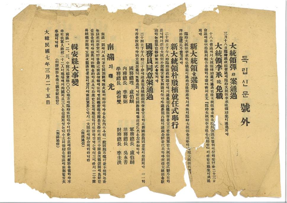그러나 임시정부 기관지인 독립신문에서 3월25일 이를 알리는 호외를 발행했다는 사실은 그동안 알려져 있지 않았다. 당시 임시정부가 중국에서 다량 발행했을 것으로 보이는 이 호외는 중국에서는 국공내전 등 전란을 거치면서, 한국에서는 일제 탄압과 해방정국, 한국전쟁 등을 거치면서 사라진 것으로 추정된다. 국사편찬위원회가 장자크 홍 푸안에게 기증받은 자료를 보면, “대통령 이승만 면직”, “신(新)대통령을 선거”, “신대통령 박은식 취임식 거행”, “국무원 동의안 통과” 등의 제목으로 당시 상황을 비교적 건조하게 알리고 있다. 곳곳이 찢어져 있는 등 보존상태는 완벽하지 않지만, 거의 모든 글자를 알아볼 수 있다.