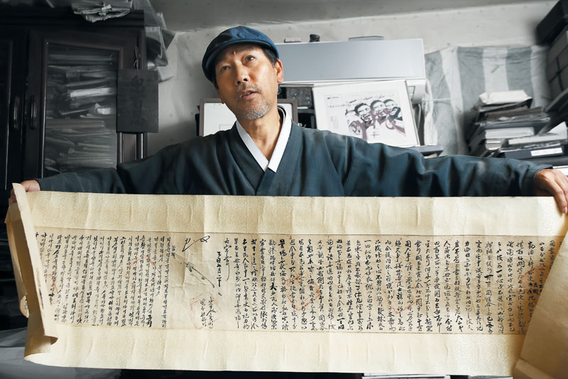 (사진2) 흥선대원군이 1865년 경복궁을 중수할 때 부역꾼을 보내라고 요청한 공문을 서지학자 김연갑씨가 펼쳐보이고 있다. / 양수열 영상미디어 기자